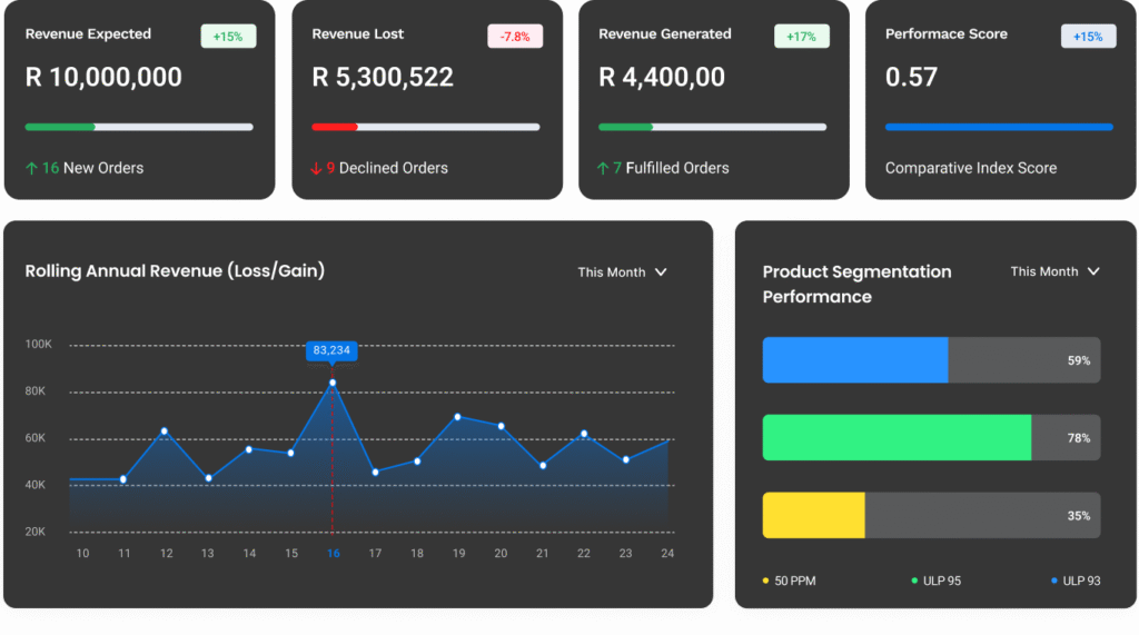 We connect your entire operation, from finance to logistics, in one unified platform. Track every order, streamline communication, and provide real time data across every department. With customisable dashboards and powerful insights, Jusoil gives you the clarity and control you need to minimise losses and maximise efficiency.